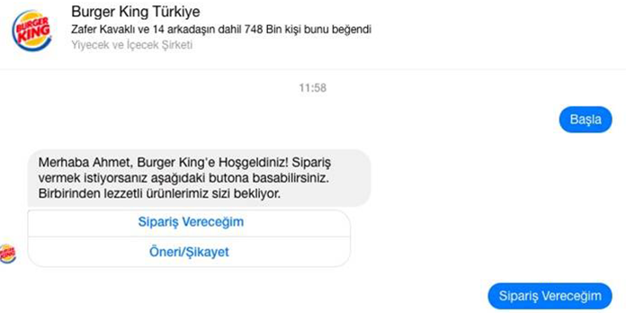 Geçtiğimiz yılın Mayıs ayında yurt dışında Messenger Bot ile Facebook üzerinden sipariş almaya başlayan Burger King, ülkemizde ise Popeyes, Sbarro, Arby’s ve Usta Dönerci gibi markalar tarafından da kullanılan Tıkla Gelsin’e bağlı bir sistem kullanıyor. Sistem sayesinde kullanıcılar Facebook’tan çıkmadan Tıkla Gelsin’e üye olup zaman ve mekan sınırı tanımadan, diledikleri an sipariş verebilecek.