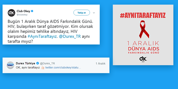 İlk olarak Club Okey Twitter hesabı, 1 Aralık Dünya AIDS Farkındalık Günü’nü hatırlatarak rakibi Durex’i #AynıTaraftayız diyerek etiketledi. Twitter hesabında aktif paylaşım yapmayan Durex Türkiye, gecikmeli de olsa rakibine yanıt vermeyi ihmal etmedi.