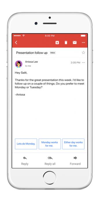 Akıllı Yanıt, e-postalarınızın alt kısmında seçim yapabileceğiniz üç seçeneği gösterir. Birini seçtikten sonra, hemen gönderebilir veya beğeninize göre değiştirebilirsiniz. Özellik, öncelikle İngilizce konuşanlar için Android ve iOS‘ta tüm dünyaya yayılıyor. Önümüzdeki haftalarda İspanyolca dil seçeneği de eklenecek.