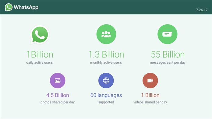 Şirket, yalnızca bir yıl önce her ay 1 milyar kişinin WhatsApp kullandığını açıklamıştı. Bu, Facebook’un dijital dünyadaki liderliğinin bir kanıtıdır. Tüm Facebook platformlarının günlük kullanıcı sayısı bulunmasa da; Instagram, Messenger ve Facebook’un sırasıyla 700 milyon, 1.2 milyar ve 2 milyar aylık kullanıcı sayısının bulunduğunu biliyoruz.